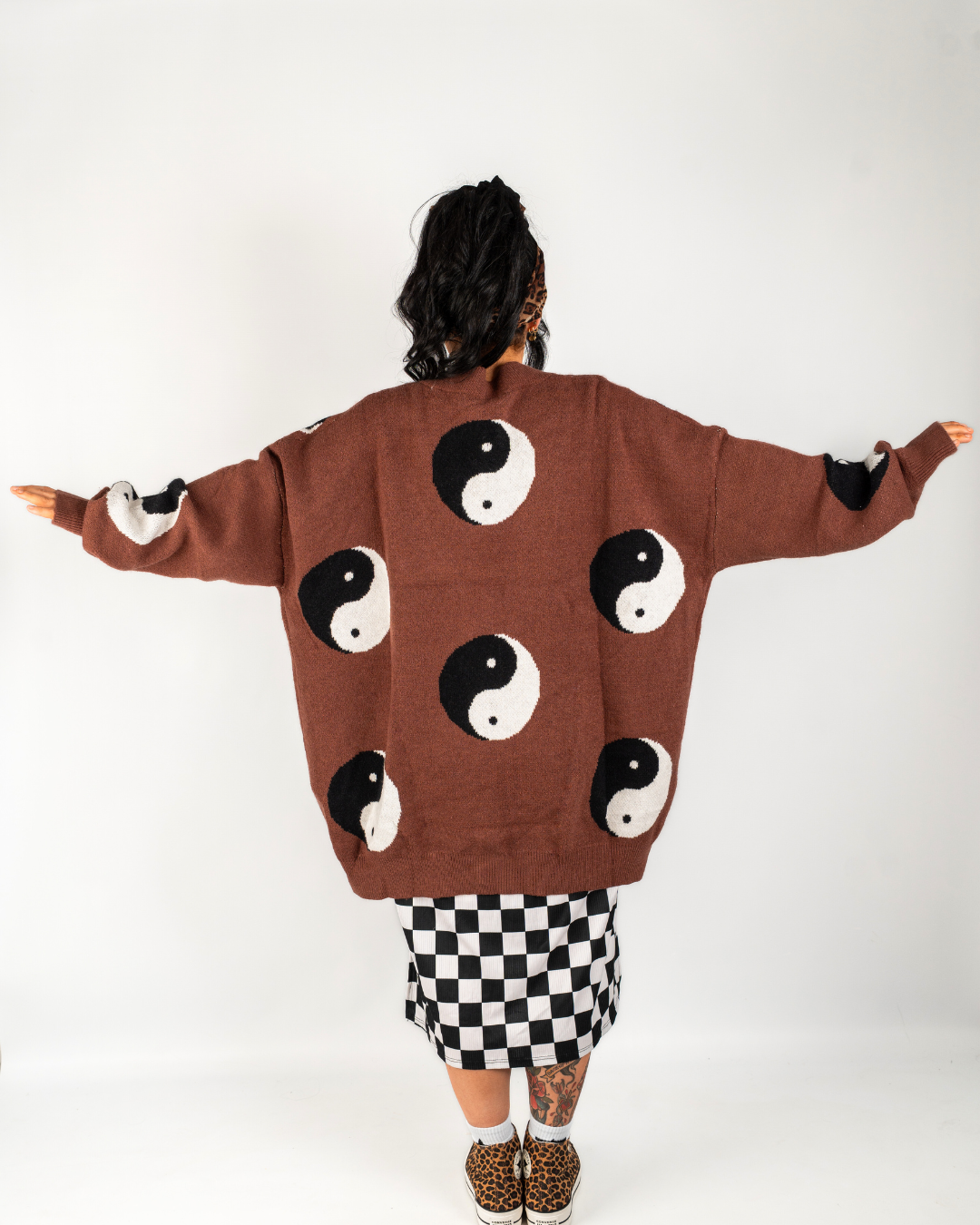This cardigan is more than balance — it’s oversized confidence. Throw it over cargos, denim, or a mini and boots, and let the yin yang print do the talking.